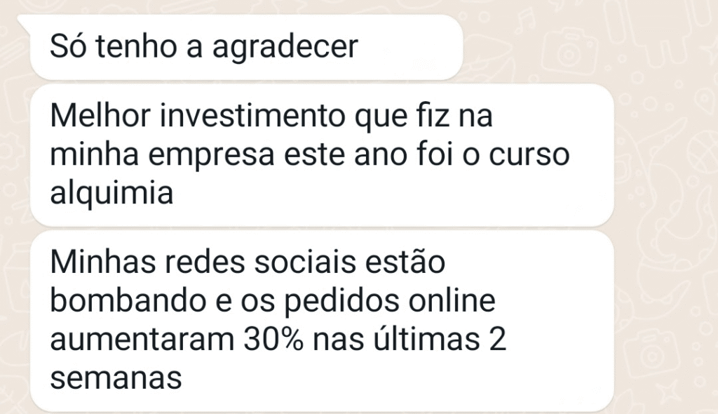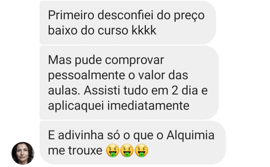 Você adquire agora o acesso completo ao curso ALQUIMIA pela condição especial de R$ 97,00 e tem 7 dias para avaliar. Se por algum motivo você achar que este material não é pra você, ou que não vale o investimento, basta me enviar uma mensagem que devolvo integralmente seu dinheiro. Agora a decisão de começar é sua!